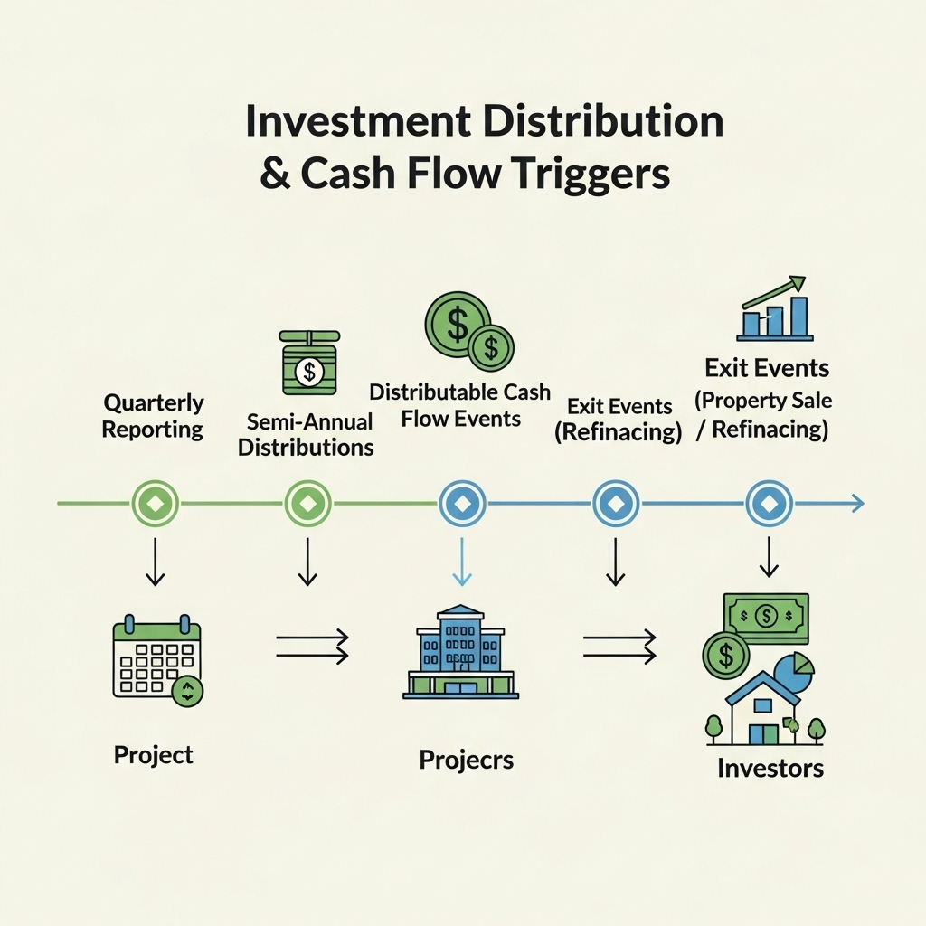 - Distributable Cash Flow: When a project generates income from sales, rental cash flow, or refinancing, available funds are distributed to investors first, following the preferred return structure.